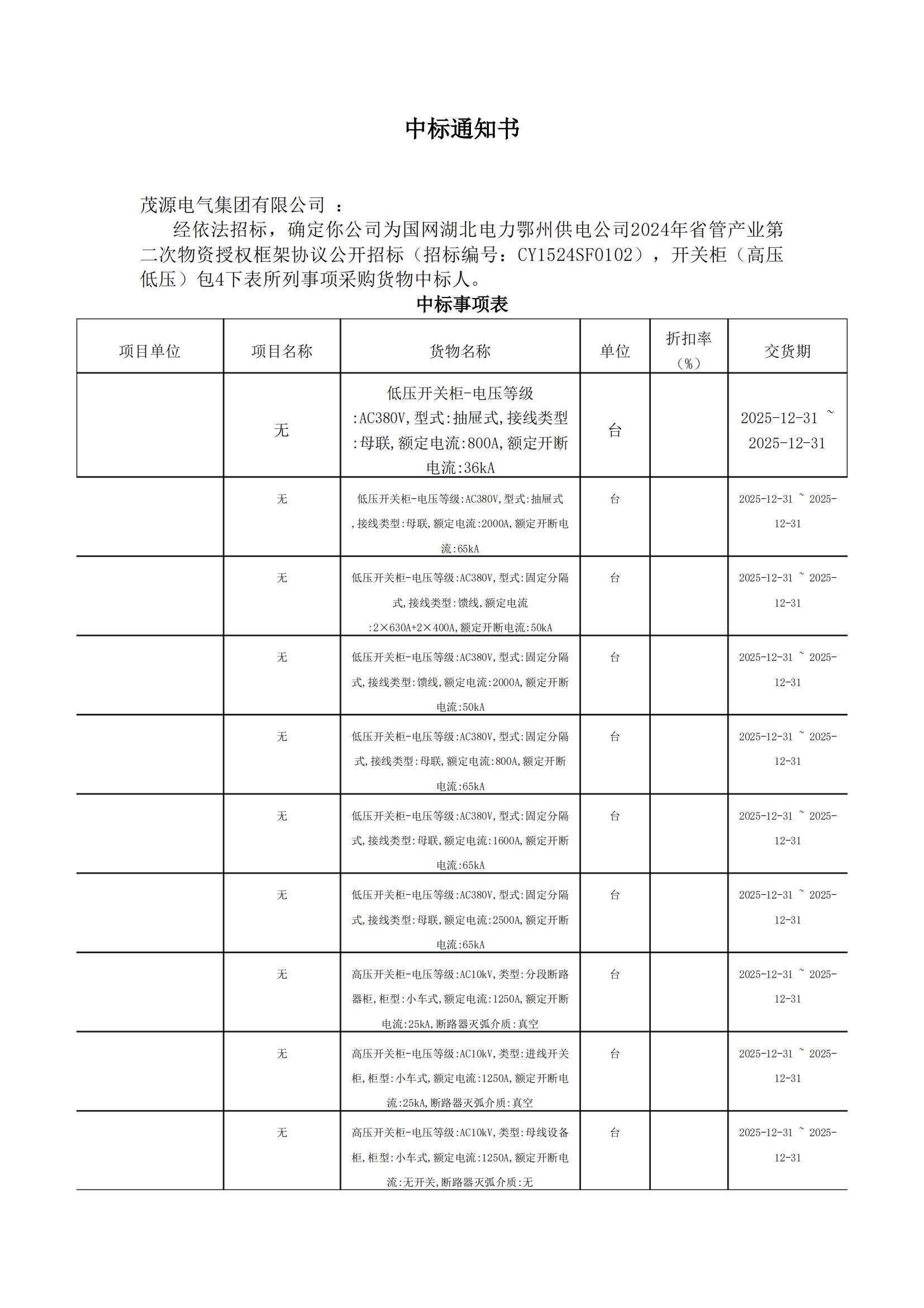 此次中标不仅是市场对茂源电气技术实力和服务质量的肯定,更是对茂源电气在电力行业中专业能力的认可。茂源电气感谢国网湖北电力鄂州供电公司的信任与支持,并承诺将严格按照采购文件要求,确保项目的顺利实施和产品的高质量交付。